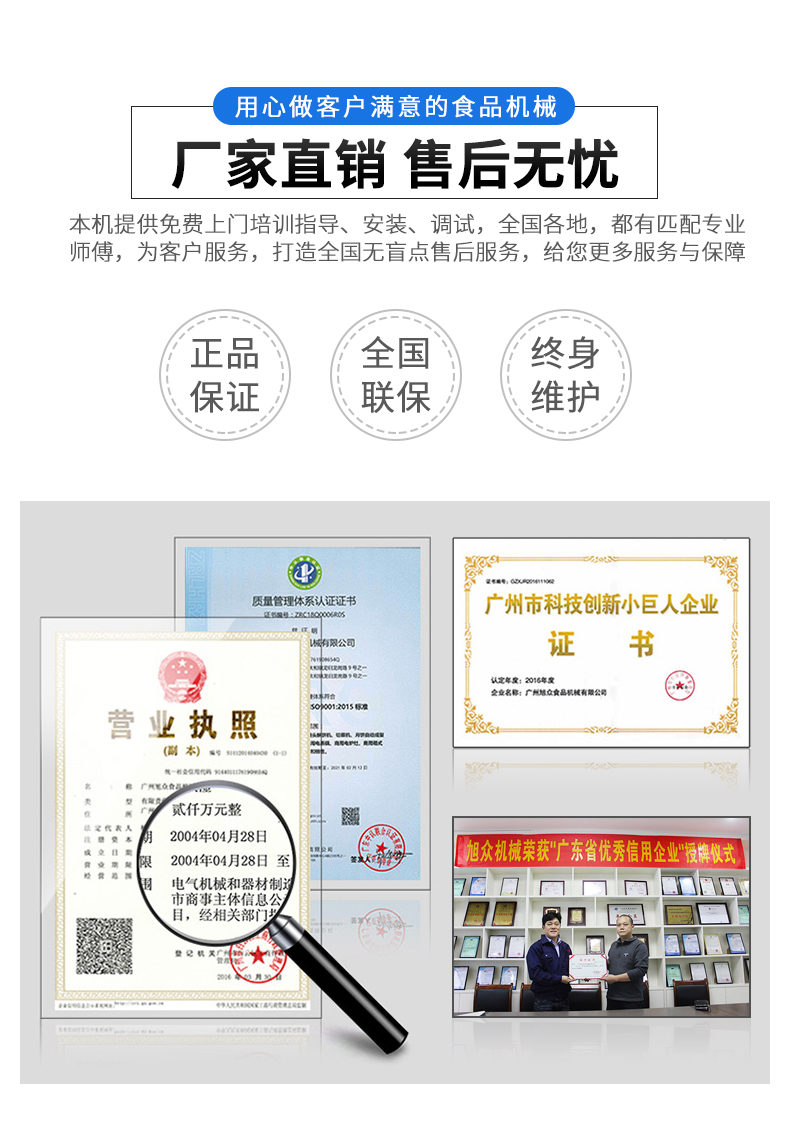 廣州旭眾食品機械有限公司是一家集科研開發(fā),生產(chǎn)設(shè)計,營銷服務(wù)為一體的現(xiàn)代化生產(chǎn)企業(yè)?,F(xiàn)代化生產(chǎn)車間,精湛制造技術(shù),所產(chǎn)機械歷經(jīng)市場重重考驗,不斷贏得海內(nèi)外客戶的贊譽。