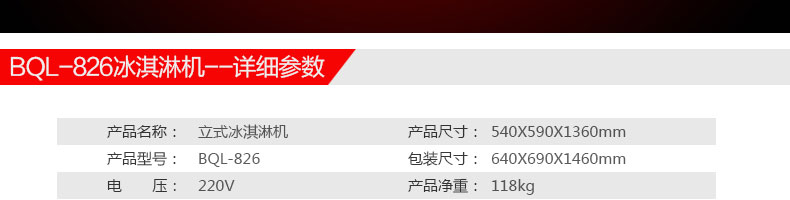 名稱BQL-826立式冰淇淋機(jī) 電源220V 功率2.2kw 產(chǎn)量18-28L/h 尺寸 540*590*1360mm 重量118kg 規(guī)格 其他