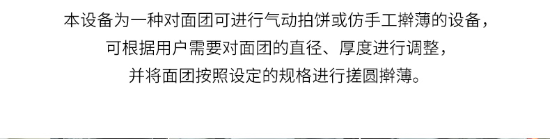 XZ-150型搟薄機,為一種對面團可進行氣動拍餅或仿手工搟薄的設(shè)備,可根據(jù)用戶需要對面團的直徑、厚度進行調(diào)整并將面團按照設(shè)定的規(guī)格進行搓圓摔搟薄。