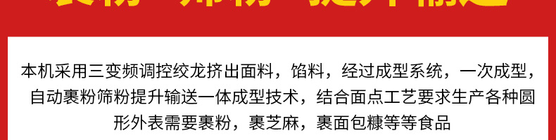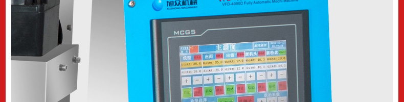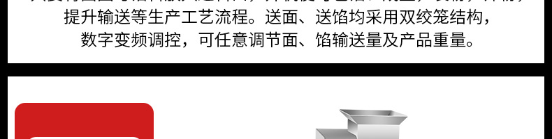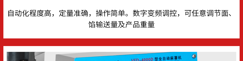 VFD-4000D麻薯機,操作簡單定量準確只要將面團與餡料放入進料口,開機便可包餡、成型,裹粉,篩粉,提升輸送等生產工藝流程。送面、送餡均采用雙絞籠結構,數字變頻調控,可任意調節(jié)面、餡輸送量及產品重量。
