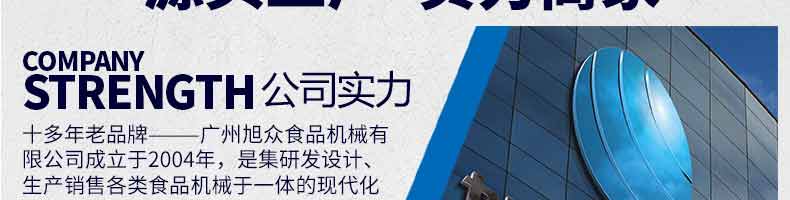 廣州旭眾食品機械有限公司是一家集科研開發(fā),生產(chǎn)設(shè)計,營銷服務(wù)為一體的現(xiàn)代化生產(chǎn)企業(yè)。現(xiàn)代化生產(chǎn)車間,精湛制造技術(shù),所產(chǎn)機械歷經(jīng)市場重重考驗,不斷贏得海內(nèi)外客戶的贊譽。