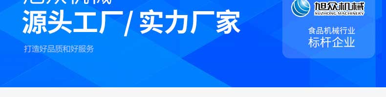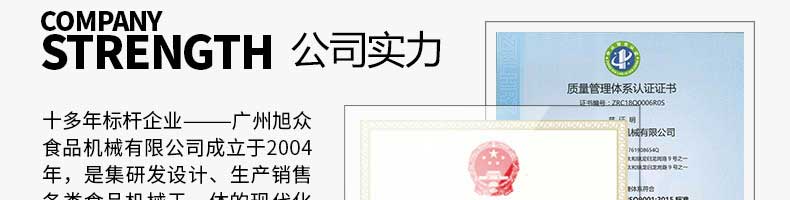 廣州旭眾食品機械有限公司是一家集科研開發(fā),生產(chǎn)設計,營銷服務為一體的現(xiàn)代化生產(chǎn)企業(yè)。現(xiàn)代化生產(chǎn)車間,精湛制造技術,所產(chǎn)機械歷經(jīng)市場重重考驗,不斷贏得海內(nèi)外客戶的贊譽。