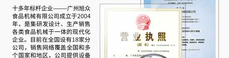 廣州旭眾食品機(jī)械有限公司是一家集科研開(kāi)發(fā),生產(chǎn)設(shè)計(jì),營(yíng)銷服務(wù)為一體的現(xiàn)代化生產(chǎn)企業(yè)?,F(xiàn)代化生產(chǎn)車(chē)間,精湛制造技術(shù),所產(chǎn)機(jī)械歷經(jīng)市場(chǎng)重重考驗(yàn),不斷贏得海內(nèi)外客戶的贊譽(yù)。