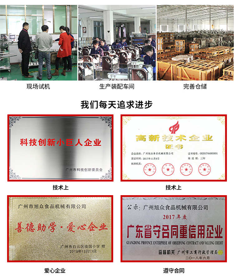 廣州旭眾食品機(jī)械有限公司是一家集科研開(kāi)發(fā),生產(chǎn)設(shè)計(jì),營(yíng)銷(xiāo)服務(wù)為一體的現(xiàn)代化生產(chǎn)企業(yè)?,F(xiàn)代化生產(chǎn)車(chē)間,精湛制造技術(shù),所產(chǎn)機(jī)械歷經(jīng)市場(chǎng)重重考驗(yàn),不斷贏得海內(nèi)外客戶(hù)的贊譽(yù)。