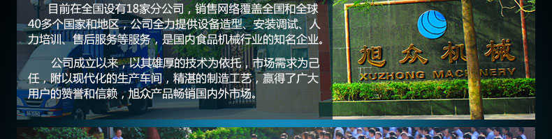 廣州旭眾食品機械有限公司是一家集科研開發(fā),生產(chǎn)設(shè)計,營銷服務(wù)為一體的現(xiàn)代化生產(chǎn)企業(yè)?,F(xiàn)代化生產(chǎn)車間,精湛制造技術(shù),所產(chǎn)機械歷經(jīng)市場重重考驗,不斷贏得海內(nèi)外客戶的贊譽。