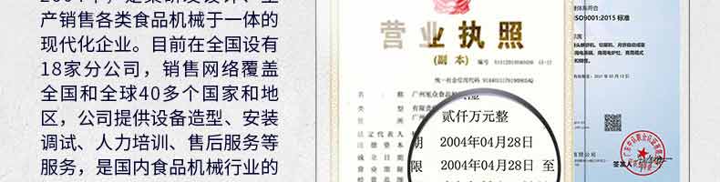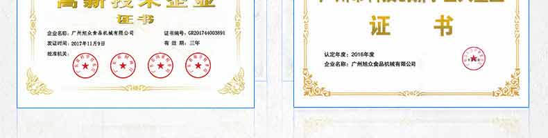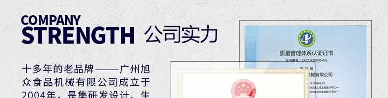 廣州旭眾食品機械有限公司是一家集科研開發(fā),生產設計,營銷服務為一體的現(xiàn)代化生產企業(yè)?,F(xiàn)代化生產車間,精湛制造技術,所產機械歷經(jīng)市場重重考驗,不斷贏得海內外客戶的贊譽。