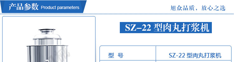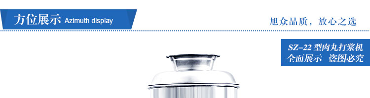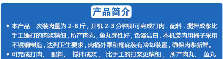 SZ-22型肉丸打漿機,本機裝肉用桶子采用不銹鋼制造,達到衛(wèi)生要求,肉桶外罩和桶底裝有冷卻裝置,確保肉漿新鮮。比手工的打漿更精細,所產(chǎn)肉丸、魚丸彈性好,色澤潔白。
