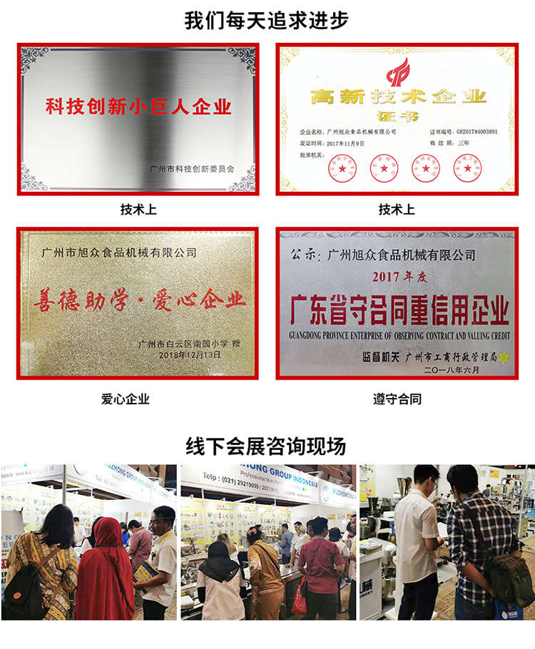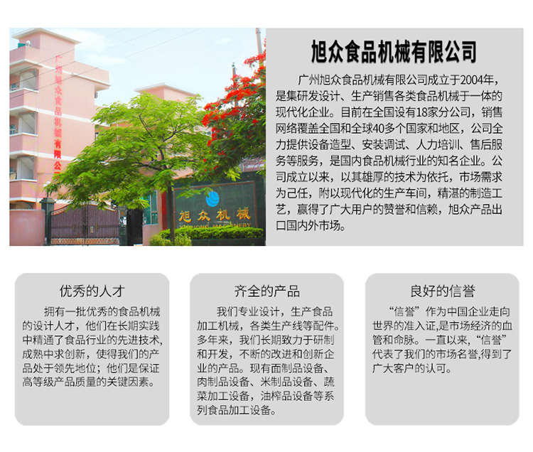廣州旭眾食品機(jī)械有限公司是一家集科研開發(fā),生產(chǎn)設(shè)計(jì),營銷服務(wù)為一體的現(xiàn)代化生產(chǎn)企業(yè)?,F(xiàn)代化生產(chǎn)車間,精湛制造技術(shù),所產(chǎn)機(jī)械歷經(jīng)市場(chǎng)重重考驗(yàn),不斷贏得海內(nèi)外客戶的贊譽(yù)。