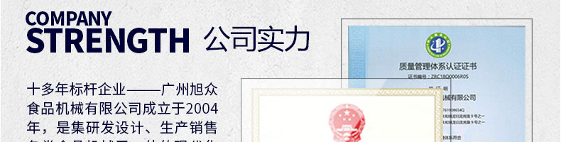 廣州旭眾食品機械有限公司是一家集科研開發(fā),生產(chǎn)設計,營銷服務為一體的現(xiàn)代化生產(chǎn)企業(yè)?,F(xiàn)代化生產(chǎn)車間,精湛制造技術,所產(chǎn)機械歷經(jīng)市場重重考驗,不斷贏得海內外客戶的贊譽。