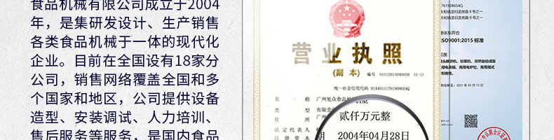 廣州旭眾食品機械有限公司是一家集科研開發(fā),生產(chǎn)設(shè)計,營銷服務(wù)為一體的現(xiàn)代化生產(chǎn)企業(yè)。現(xiàn)代化生產(chǎn)車間,精湛制造技術(shù),所產(chǎn)機械歷經(jīng)市場重重考驗,不斷贏得海內(nèi)外客戶的贊譽。