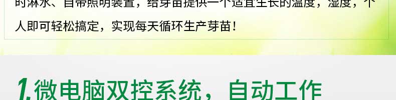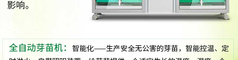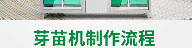 芽苗機(jī)系列,全自動(dòng)芽苗機(jī):智能化一生產(chǎn)安全無(wú)公害的芽苗,智能控溫、定時(shí)淋水、自帶照明裝置,給芽苗提供一個(gè)適宜生長(zhǎng)的溫度,濕度,個(gè)人即可輕松搞定,實(shí)現(xiàn)每天循環(huán)生產(chǎn)芽苗!