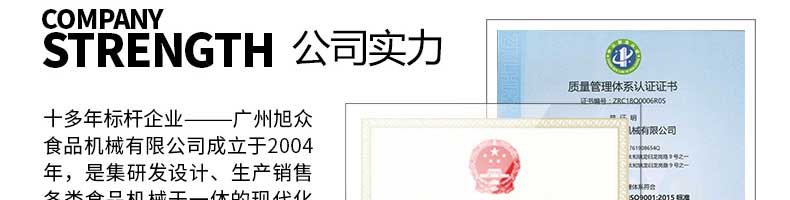 廣州旭眾食品機(jī)械有限公司是一家集科研開發(fā),生產(chǎn)設(shè)計(jì),營(yíng)銷服務(wù)為一體的現(xiàn)代化生產(chǎn)企業(yè)。現(xiàn)代化生產(chǎn)車間,精湛制造技術(shù),所產(chǎn)機(jī)械歷經(jīng)市場(chǎng)重重考驗(yàn),不斷贏得海內(nèi)外客戶的贊譽(yù)。