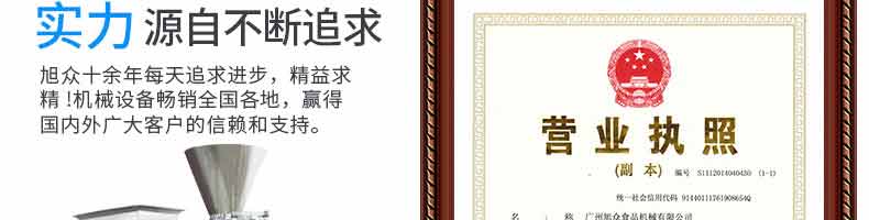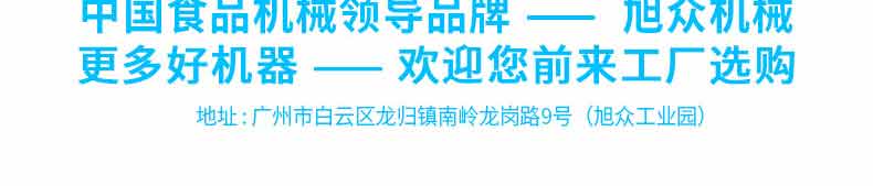 廣州旭眾食品機(jī)械有限公司是一家集科研開(kāi)發(fā),生產(chǎn)設(shè)計(jì),營(yíng)銷(xiāo)服務(wù)為一體的現(xiàn)代化生產(chǎn)企業(yè)?,F(xiàn)代化生產(chǎn)車(chē)間,精湛制造技術(shù),所產(chǎn)機(jī)械歷經(jīng)市場(chǎng)重重考驗(yàn),不斷贏得海內(nèi)外客戶(hù)的贊譽(yù)。