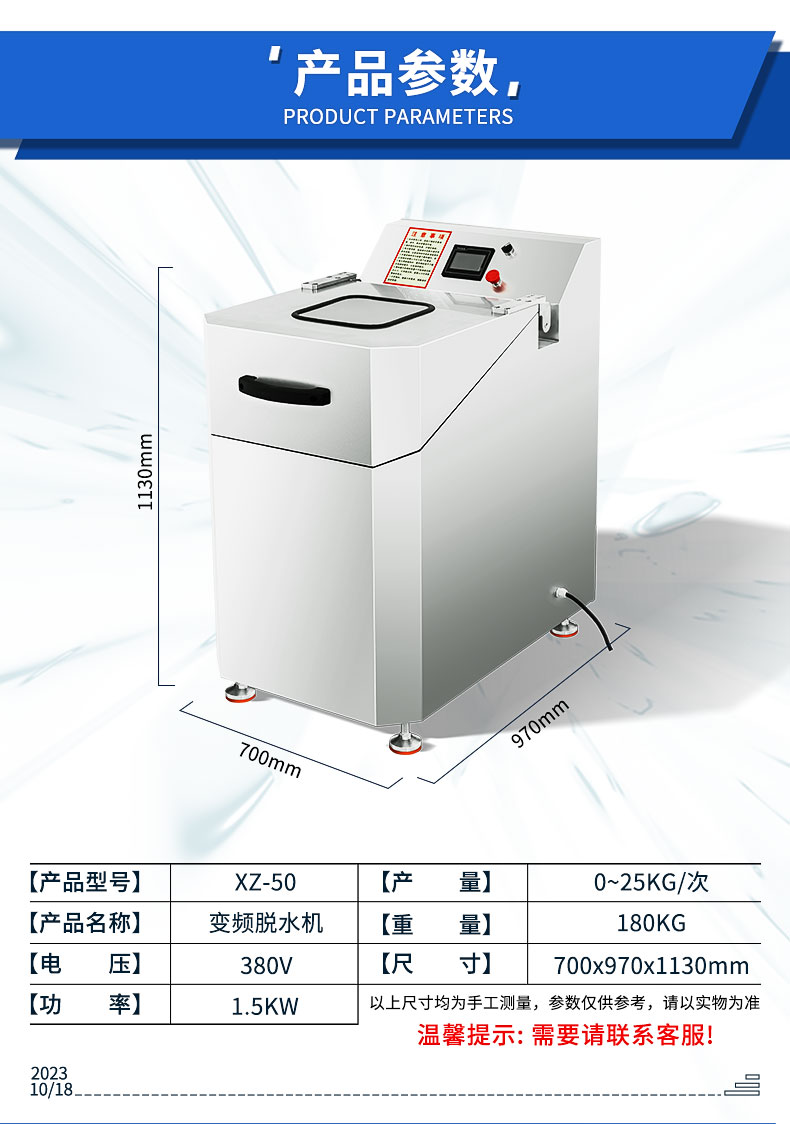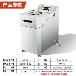 XZ-50型脫水機(jī),蔬菜脫水食品甩干,變頻控制、方便快捷。速度調(diào)頻,脫水速度可根據(jù)不同產(chǎn)品需求調(diào)節(jié)不同速度。鈑金機(jī)身,機(jī)架鈑金是 2MM 厚,使整機(jī)運(yùn)行時(shí)更穩(wěn)定,噪音更小。