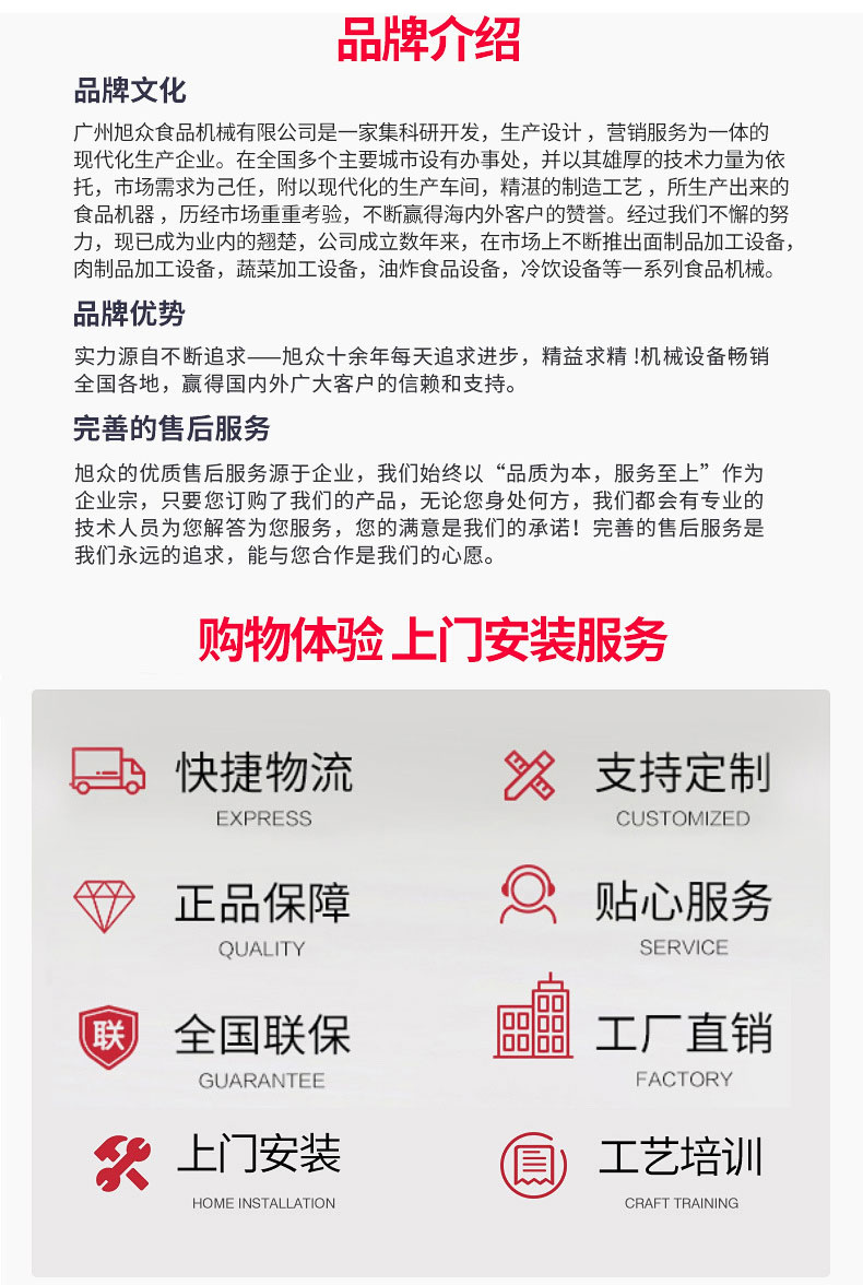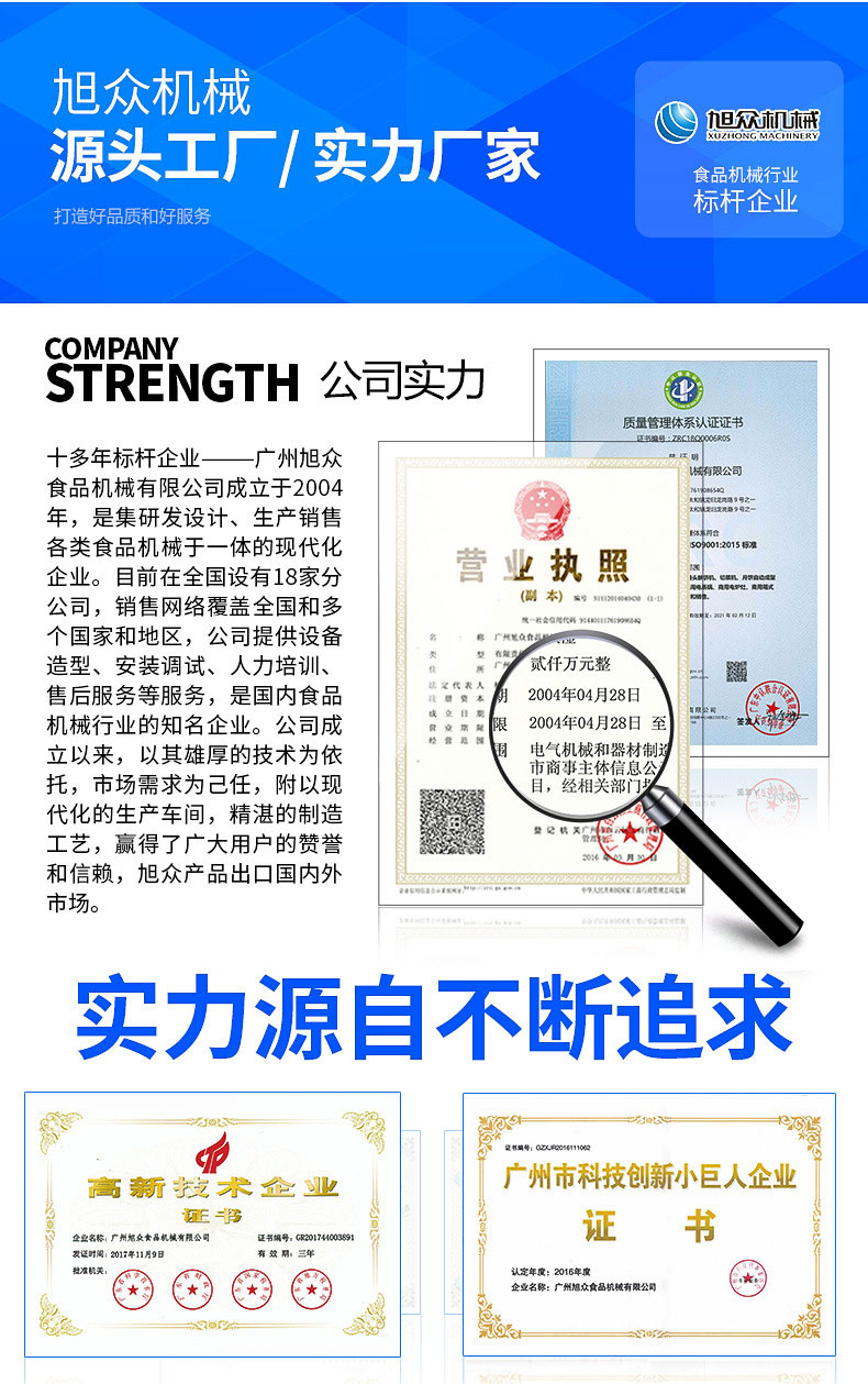 廣州旭眾食品機(jī)械有限公司是一家集科研開發(fā),生產(chǎn)設(shè)計(jì),營(yíng)銷服務(wù)為一體的現(xiàn)代化生產(chǎn)企業(yè)?,F(xiàn)代化生產(chǎn)車間,精湛制造技術(shù),所產(chǎn)機(jī)械歷經(jīng)市場(chǎng)重重考驗(yàn),不斷贏得海內(nèi)外客戶的贊譽(yù)。