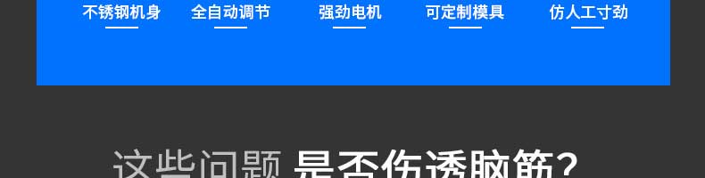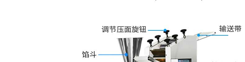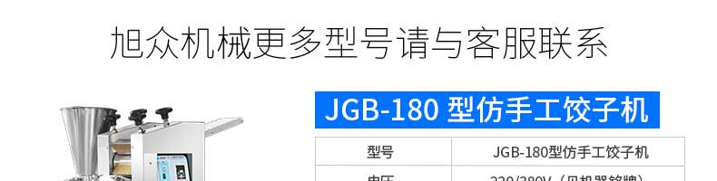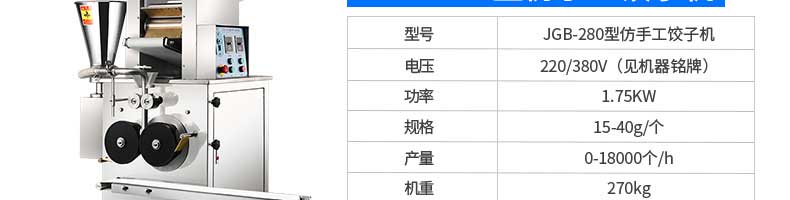 名稱JGB-360仿手工餃子機(jī) 電源220/380v 功率1.75kw 產(chǎn)量0-24000個(gè)/h 尺寸3680*820*1450mm 重量450kg 規(guī)格12-38g/個(gè) 其他