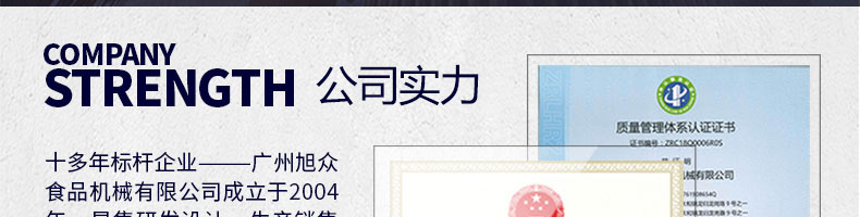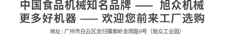 廣州旭眾食品機(jī)械有限公司是一家集科研開發(fā),生產(chǎn)設(shè)計,營銷服務(wù)為一體的現(xiàn)代化生產(chǎn)企業(yè)。現(xiàn)代化生產(chǎn)車間,精湛制造技術(shù),所產(chǎn)機(jī)械歷經(jīng)市場重重考驗,不斷贏得海內(nèi)外客戶的贊譽(yù)。