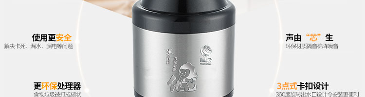 DCLQ40-廚房垃圾處理器,該機(jī)是一種現(xiàn)代化的廚房電器,它用全新的方法來處理現(xiàn)代家庭中的食品廢物。處理器裝于廚房水槽下,能夠有效地將食物垃圾研磨成細(xì)小顆粒,直接從下水管道排出,從而輕松實(shí)現(xiàn)及時(shí)方便快捷的廚房清潔,優(yōu)化家居環(huán)境。