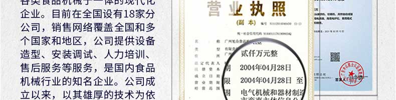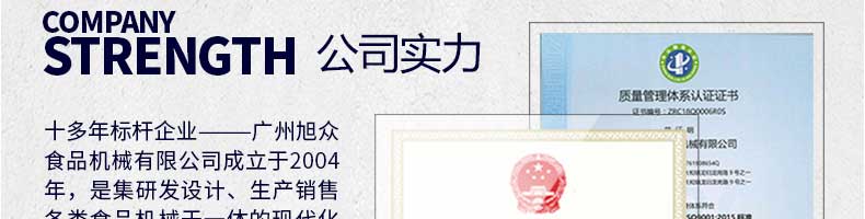 廣州旭眾食品機(jī)械有限公司是一家集科研開發(fā),生產(chǎn)設(shè)計(jì),營(yíng)銷服務(wù)為一體的現(xiàn)代化生產(chǎn)企業(yè)。現(xiàn)代化生產(chǎn)車間,精湛制造技術(shù),所產(chǎn)機(jī)械歷經(jīng)市場(chǎng)重重考驗(yàn),不斷贏得海內(nèi)外客戶的贊譽(yù)。