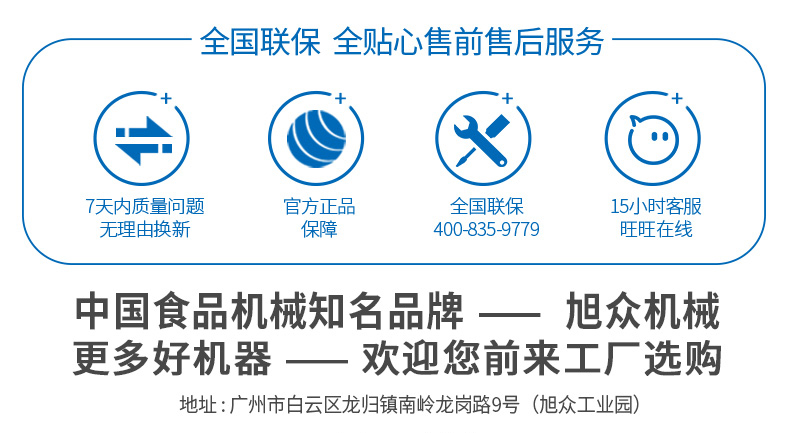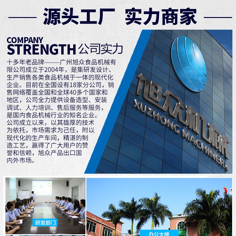 廣州旭眾食品機(jī)械有限公司是一家集科研開(kāi)發(fā),生產(chǎn)設(shè)計(jì),營(yíng)銷服務(wù)為一體的現(xiàn)代化生產(chǎn)企業(yè)?,F(xiàn)代化生產(chǎn)車間,精湛制造技術(shù),所產(chǎn)機(jī)械歷經(jīng)市場(chǎng)重重考驗(yàn),不斷贏得海內(nèi)外客戶的贊譽(yù)。