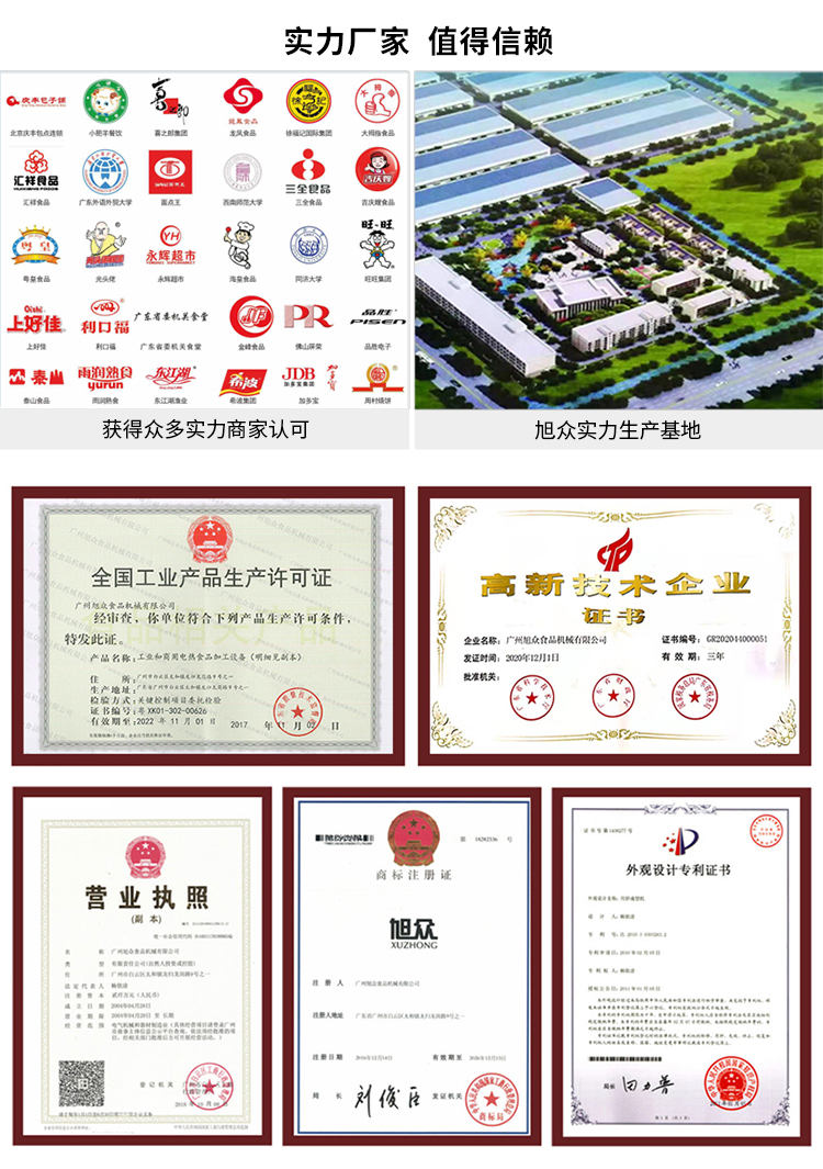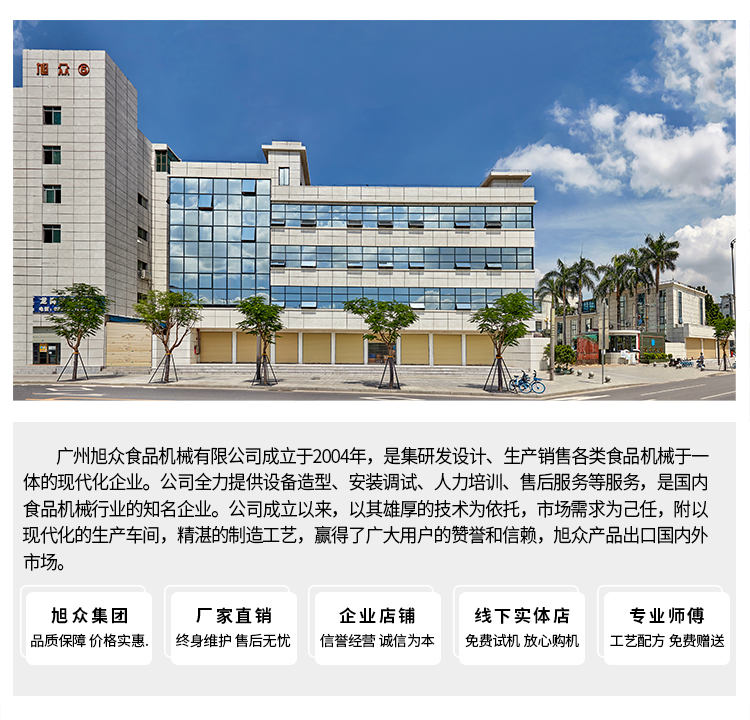 廣州旭眾食品機械有限公司是一家集科研開發(fā),生產(chǎn)設(shè)計,營銷服務(wù)為一體的現(xiàn)代化生產(chǎn)企業(yè)。現(xiàn)代化生產(chǎn)車間,精湛制造技術(shù),所產(chǎn)機械歷經(jīng)市場重重考驗,不斷贏得海內(nèi)外客戶的贊譽。