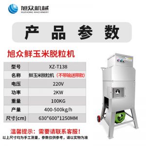 XZ-T138玉米脫粒機,鮮玉米脫粒機,高效脫粒。用于新鮮甜糯玉米脫粒工作,能很方便地把籽粒與梗桿分離。入料方便、脫凈率高、不碎粒不爛芯。每分鐘處理75個玉米穗。高效脫粒,滿足商用,籽粒產(chǎn)量約為500-600Kg/h
