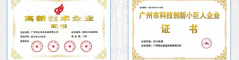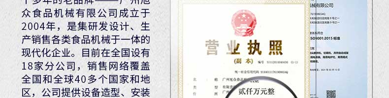 廣州旭眾食品機械有限公司是一家集科研開發(fā),生產(chǎn)設(shè)計,營銷服務(wù)為一體的現(xiàn)代化生產(chǎn)企業(yè)?,F(xiàn)代化生產(chǎn)車間,精湛制造技術(shù),所產(chǎn)機械歷經(jīng)市場重重考驗,不斷贏得海內(nèi)外客戶的贊譽。